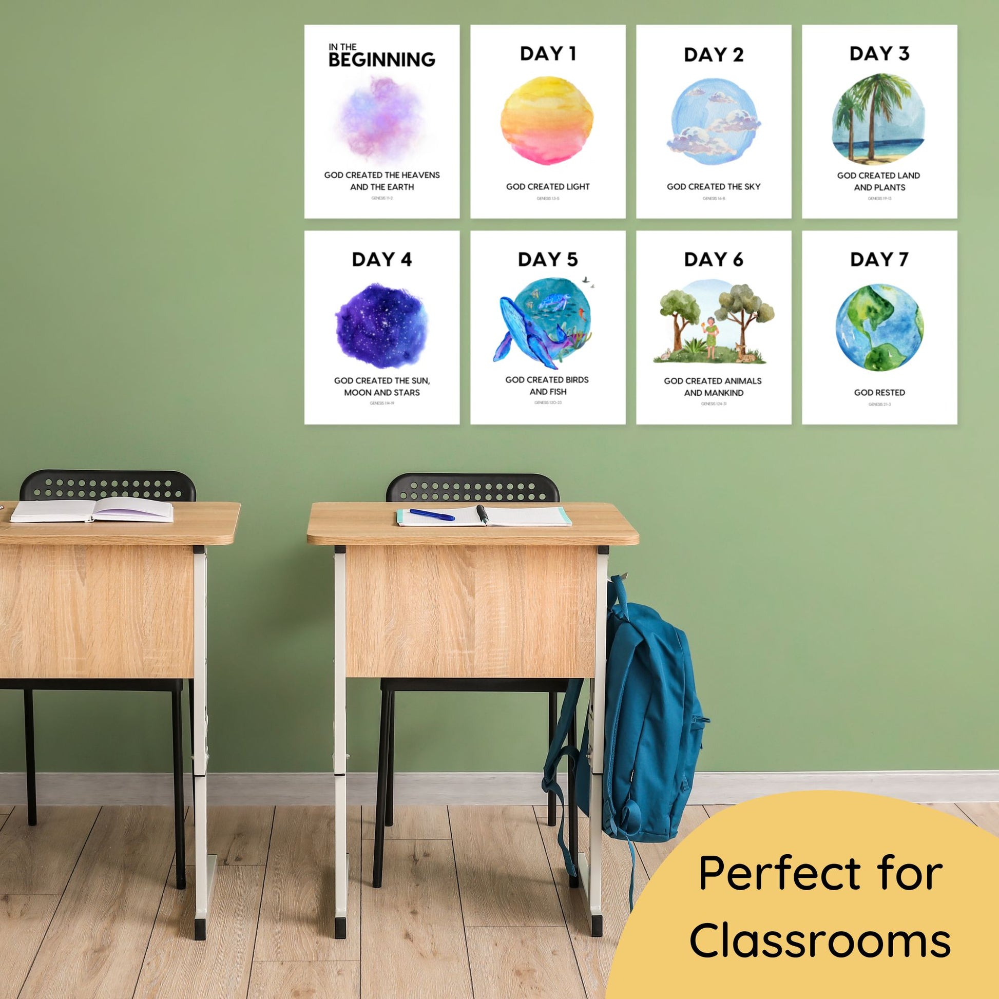 Each poster set includes 8 prints (8"x10") featuring a beautiful day-by-day look at God's creation. Posters are printed on premium, thick paper with gloss and can be displayed directly on the wall or hung in picture frames (not included).